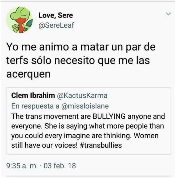 «También, si eres una TERF, que te follen con el palo de un bate de béisbol envuelto en alambre de púas«.